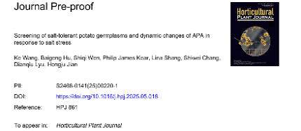 薯类团队在Horticultural Plant Journal上在线发表了题为“Screening of Salt-tolerant Potato Germplasms and Dynamic Changes of APA in Response to Salt Stress”的研究论文,首次绘制马铃薯盐胁迫下的全基因组APA动态图谱。该研究深化了对马铃薯逆境响应机制的理解,为马铃薯耐盐遗传改良提供了新的分子靶点和理论依据。