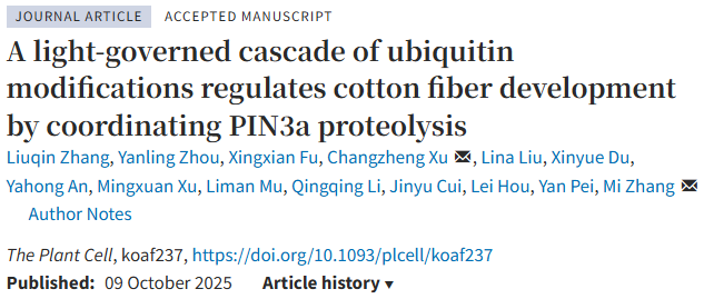 张觅课题组在植物学权威期刊The Plant Cell上发表题为A light-governed cascade of ubiquitin modifications regulates cotton fiber development by coordinating PIN3a proteolysis的研究论文,揭示了光信号通过级联泛素化修饰控制PIN3a蛋白稳定性,调控棉花纤维发育的新机制。