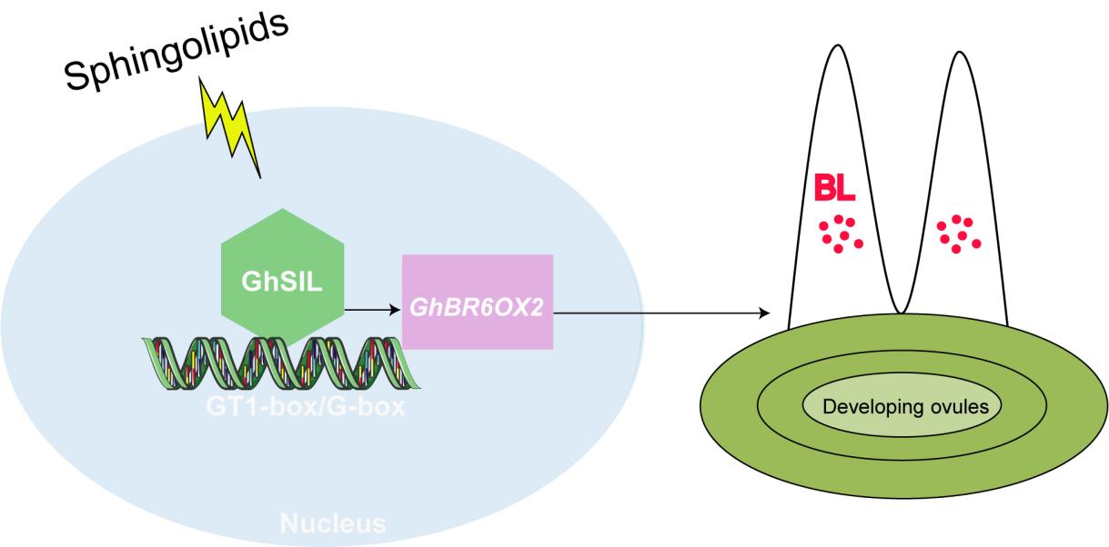 图4 GhSIL结合GhBR6OX2启动子的GT1-box顺式元件,激活GhBR6OX2的转录,增强BL含量的生物合成,促进棉纤维细胞伸长的工作模型