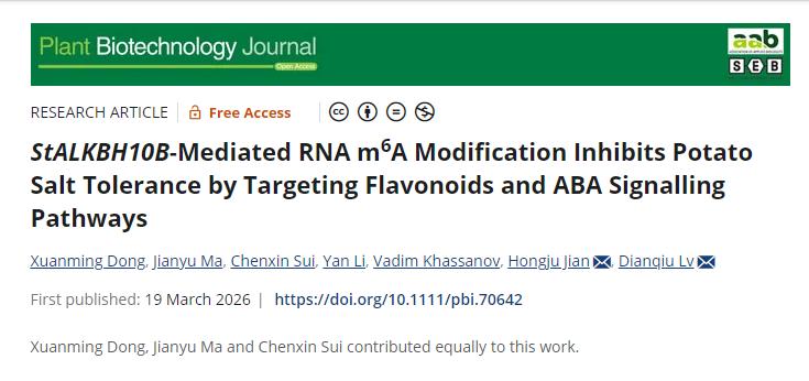 吕典秋课题组在植物学领域国际知名期刊《Plant Biotechnology Journal》上发表题为“StALKBH10B-mediated RNA m6A modification inhibits potato salt tolerance by targeting flavonoids and ABA signaling pathways”的研究论文。该研究首次在全转录组水平解析了m6A甲基化修饰调控马铃薯耐盐性的分子机制,阐明了StALKBH10B通过协同调控ABA信号和类黄酮合成两条关键通路影响盐胁迫应答的分子网络,为深入理解马铃薯耐盐性的表观调控机制提供了新见解,也为耐盐马铃薯种质创新提供了新的分子靶点和育种策略。