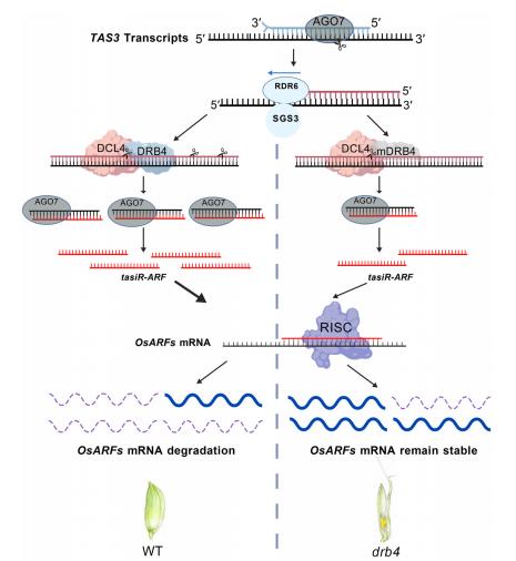 水稻是全球最重要的粮食作物之一,其产量形成高度依赖于花器官的正常发育。外稃作为小穗最外层的保护结构,其极性建立直接影响颖花形态及产量形成。该研究鉴定了双链RNA结合蛋白DRB4在水稻外稃极性发育中的核心调控功能:DRB4通过与OsDCL4蛋白互作,介导tasiR-ARF的形成,并维持下游靶基因OsARFs的精确极性表达,从而确保外稃沿近远轴方向的正常发育。DRB4功能缺失会导致外稃形态异常,如明显变窄甚至丝状化,揭示了小RNA通路在单子叶植物花器官形态建成中的重要作用。研究最终提出“DRB4-OsDCL4-tasiR-ARF-OsARF”调控模块,从分子层面阐明了外稃极性形成的关键机制,拓展了人们对水稻花器官发育分子机制的理解。
